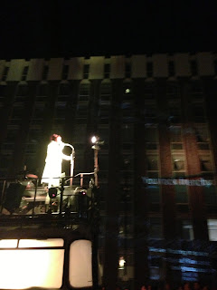 Ar the end of my road was a mass of people, a large bus with a French woman in white on top, lots of big lights on wheels and projections onto the buildings nearby. As I reached the end of the road it moved off around the corner and I headed back to bed.