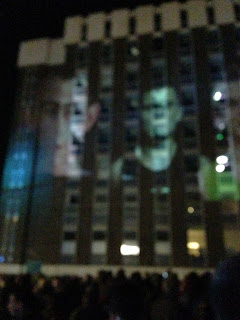 The next night I was ready and headed out at the first sound. Figures Libres was the name of the event which had been snaking its way around the city since dusk. The crowd were encouraged to send text messages that were then rad aloud to the trip hop sound track and projected onto the walls of buildings; the images then morphed into faces of people as the bus and crowd turned the corner into New England Road.